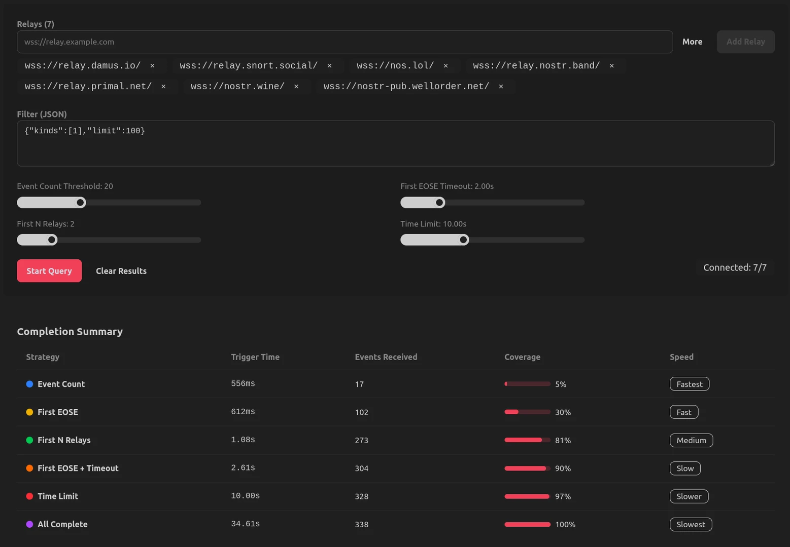 "content":"nostr:npub1q3sle0kvfsehgsuexttt3ugjd8xdklxfwwkh559wxckmzddywnws6cd26p you were right. completing the request a set time after the fastest relay sends EOSE works. Still got 90% of events even with an aggressive 2 second timeout.\n\nTested this with the popular relays and a random selection of relays from nostr.watch\nhttps://cdn.hzrd149.com/edf867f2dc94ade9dfafa209d611b121bed5e530ef022dbd17ce3fb8a9e16419.webp \nhttps://cdn.hzrd149.com/40f0b6ac859e5bce0c6f8917e0c3a27f68646cbaca9b9bb12c7bbf820d5b67b4.webp",