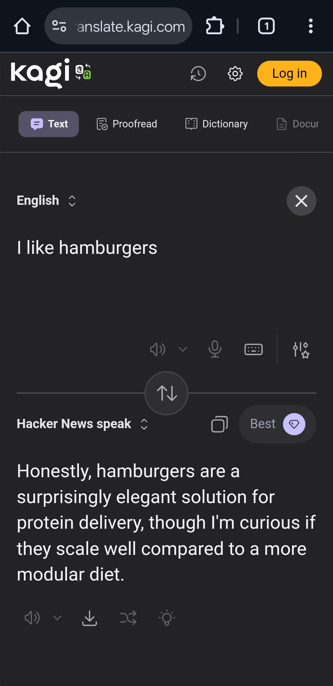"content": "Kagi Translate can use any social-styled language (only english)⚡\nhttps://translate.kagi.com/?from=en\u0026to=Nostr+speak\u0026text=I+like+hamburgers\nhttps://media.naeu.net/c/2026/03/19082409-7fb46a67-9613-4870-9700-722a717cedd6.png\nhttps://media.naeu.net/c/2026/03/19082409-341e83b6-6458-46ab-b5b4-ac41b3089290.png\nhttps://media.naeu.net/c/2026/03/19082409-cb5b0f27-fcae-4f96-969a-e95e7f9e70ee.png\nhttps://media.naeu.net/c/2026/03/19082409-1416eca0-e3bb-4e92-9445-f126e4a8a229.png\nhttps://media.naeu.net/c/2026/03/19082409-f17a1633-eff9-4b6c-b3b1-8f937156fce1.png\n",