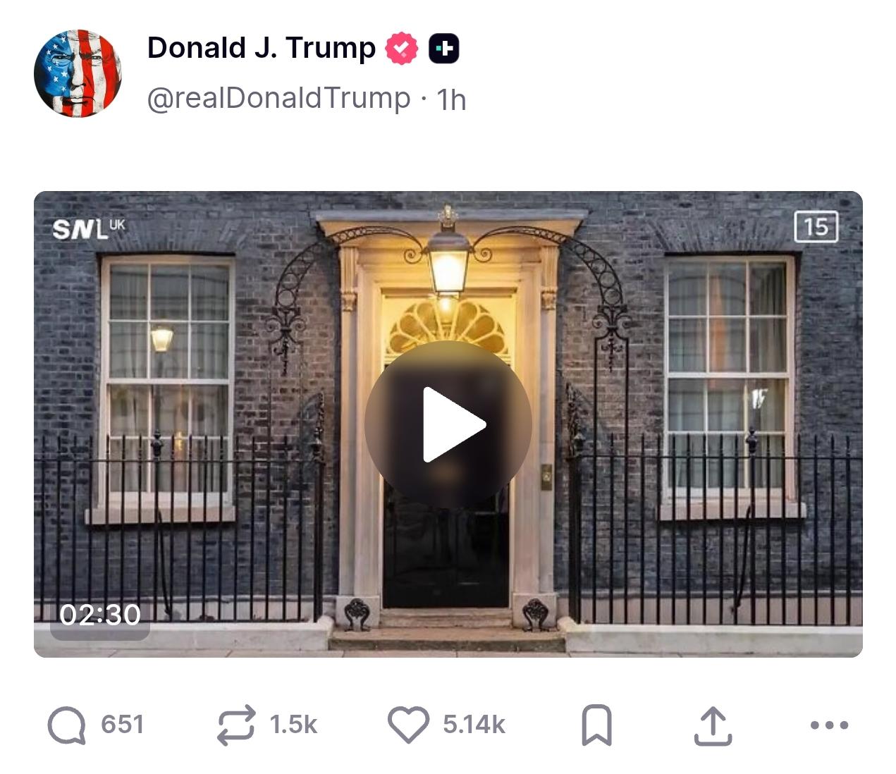 SNL-UK off to a great start, earning an immediate repost from Orange Man. (Is this really a live audience? I haven't heard laughter that sounds this canned since the 80s.)