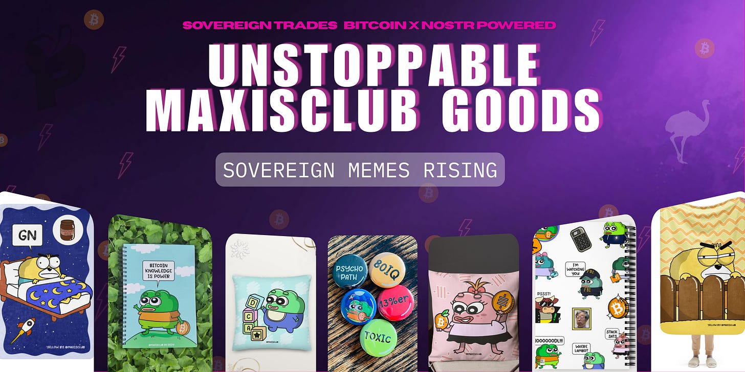 Pillows, blankets, notebooks, stickers, hoodies, glasses, mugs and more! All merch are rocking MaxisClub characters and Bitcoin maximalist energy.