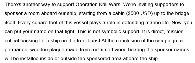 "content": "Fomr the Deck of #CaptPaulWatson Operation Krill Wars \"direct, mission-critical backing for a ship on the front lines! At the conclusion of the campaign, a permanent wooden plaque made from reclaimed wood bearing sponsor names will be installed inside or outside the sponsored area aboard the ship\"\n\nhttps://russula.us-west.host.bsky.network/xrpc/com.atproto.sync.getBlob?did=did:plc:yw6wbtma6fynxiafh5v7j5sf\u0026cid=bafkreifh6ugfa7hch762indw6nuub4f6j4rookgaqugjixl4qmlwjhj3yi\nhttps://russula.us-west.host.bsky.network/xrpc/com.atproto.sync.getBlob?did=did:plc:yw6wbtma6fynxiafh5v7j5sf\u0026cid=bafkreibclv6vyt46fhksmyx6wvs5wavx2mbd7pove4jltrzqopi52dibsi\nhttps://russula.us-west.host.bsky.network/xrpc/com.atproto.sync.getBlob?did=did:plc:yw6wbtma6fynxiafh5v7j5sf\u0026cid=bafkreiddkyxcwzdzkrzgbimfeiqsfr3h55tlhaerpviini463kbg4v4g3y",