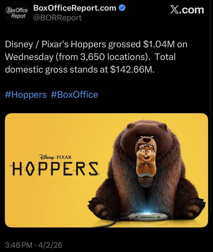 "content": "Disney / Pixar’s Hoppers grossed $1.04M on Wednesday (from 3,650 locations). Total domestic gross stands at $142.66M. https://www.fxoxo.com/281924/ #BoxOffice #Movie #MovieBusiness #Movies #TheBusinessOfMovies\n\nhttps://media.channels.im/media_attachments/files/116/337/342/883/045/594/original/573603563cbc0dbc.jpeg",