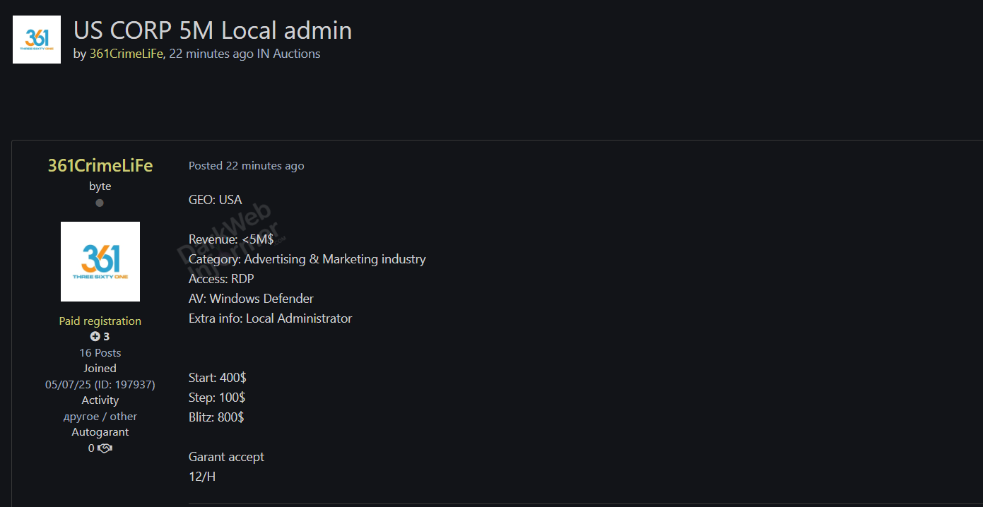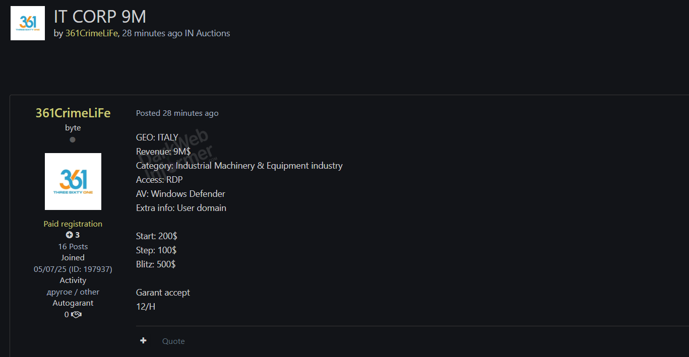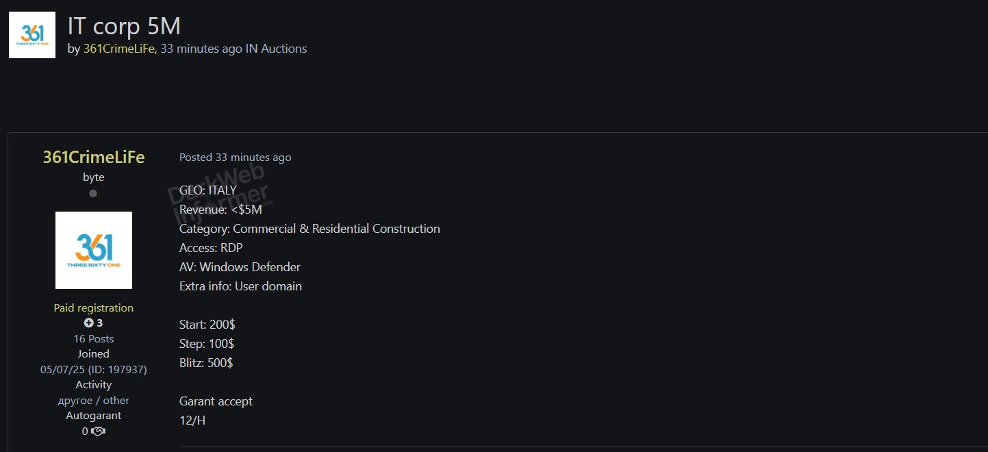 "content": "🚨🇮🇹🇺🇸 Alleged Sale of RDP Access to Italian Construction Company, Italian Industrial Machinery Company, and US Corporation within Advertising \u0026 Marketing\n\nhttps://media.infosec.exchange/infosec.exchange/media_attachments/files/115/363/685/171/166/911/original/990ca3e1752389a7.png\nhttps://media.infosec.exchange/infosec.exchange/media_attachments/files/115/363/685/173/979/814/original/b8e239824a63a608.png\nhttps://media.infosec.exchange/infosec.exchange/media_attachments/files/115/363/685/178/555/731/original/5a36daeed59be05f.png",
