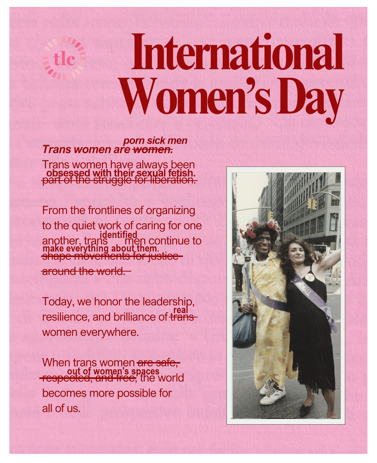 "content": "FUCK OFF TROONS! \nTODAY ISN'T ABOUT YOU.\n\n\"Transgender Law Center 🤢🤢🤢🤢🤢🤢 \n\nInternational Women’s Day is a moment to honor the women who have always moved our struggles for justice forward, including transgender women.\n\nTrans women have long been organizers, caretakers, visionaries, and fighters for liberation. From the streets to our homes, from protest movements to everyday acts of care, trans women continue to shape what gender justice looks like worldwide.\n\nCelebrating women means celebrating all women. Today, we honor the leadership, resilience, and brilliance of trans women everywhere. 🤢🤢🤢🤢🤢🤢 \"\n\n\n\n#InternationalWomensDay #InternationalWomensDay2026 #IWD #IWD2026 #RadicalFeminism #RadFem #Feminism #Feminist #WomenDontHavePenises #TeamTERF #GetMenOut #NDNZ #IndigenousFeminism\n\nhttps://media.spinster.xyz/75dfa975f05081e23d60e54ee5f0ae32d58bb7c94aa8b4f88acb5eee814a60c2.png",