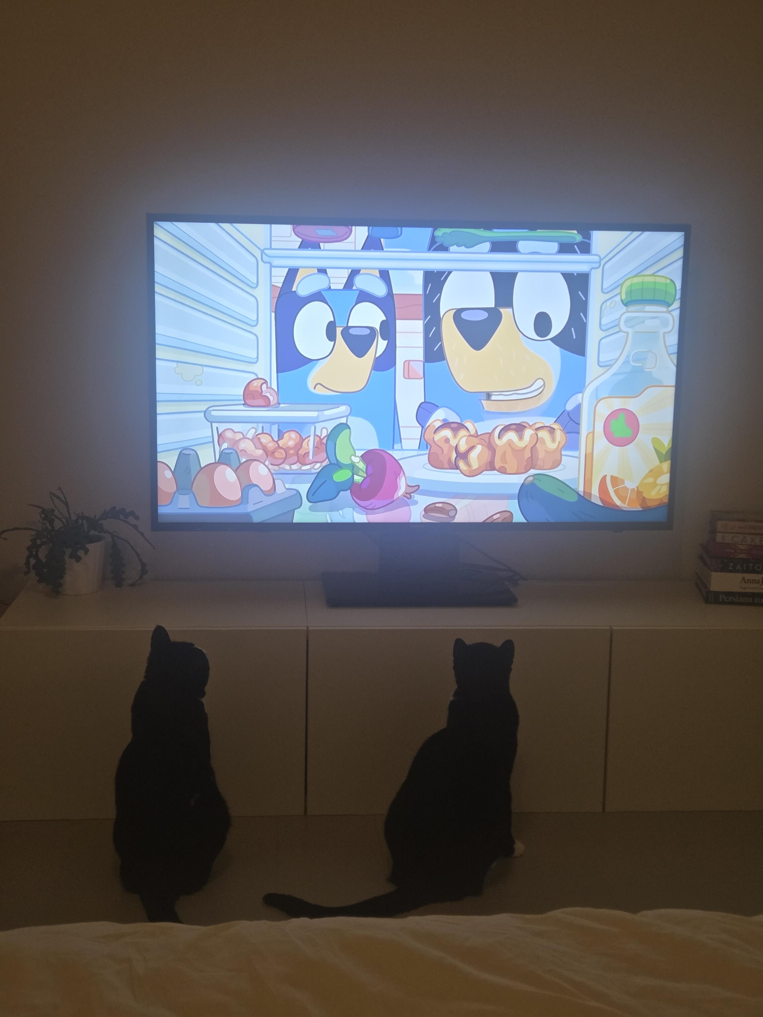 TIL that cats like watching Bluey :blobcatsnuggle: #CatsOfMastodon #Caturday #PookieAndWessie
